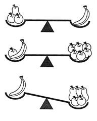 Kokį vaisių reikia padėti ant svarstyklių lėkštutės paskutinį, kad svarstyklės išlaikytų pusiausvyrą?