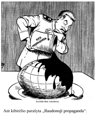 Kuris žodis geriausiai atskleidžia 1952 m. amerikiečių karikatūros „Velykų kiaušinio dažymas“ pagrindinę mintį apie Josifo Stalino skleidžiamą propagandą?