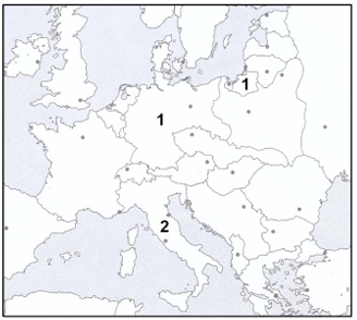 Kas sieja žemėlapyje skaitmenimis 1 ir 2 pažymėtas valstybes XX a. ketvirtajame dešimtmetyje?
