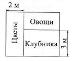 Прямоугольный огород площадью 30 м2 состоит из трех пря- 2 м моугольных участков. Одна из сторон цветочного участка, как показано на рисунке, равна 2 м, а одна из сторон клубничного участка - 3 м. Найдите площадь (в м2) овощного