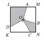 Отрезки OA, OB, OC и OD проведены из центра O квадрата KLMN так, что OA⊥OB, OC⊥OD. Сторона квадрата KLMN равна 2. Чему равна площадь закрашенной фигуры?