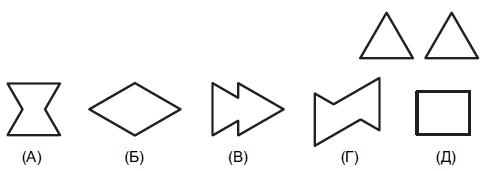 Никита кладет на лист бумаги два одинаковых треугольника (нарисованных справа) и обводит контур полученной фигуры. Какую фигуру он не сможет получить?