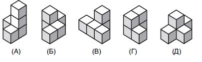Фигурка на правом рисунке составлена из 5 кубиков. Какую из фигурок (А) – (Д) нельзя получить из нее, переложив ровно один кубик?