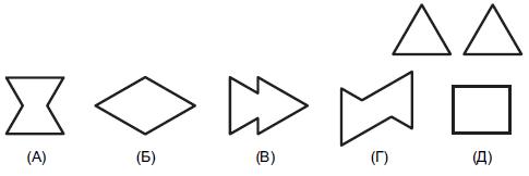 Никита кладет на лист бумаги два одинаковых треугольника (нарисованных справа) и обводит контур полученной фигуры. Какую фигуру он не сможет получить?