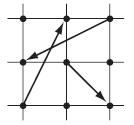 Три стрелочки, изображенные на рисунке, соединяют некоторые из 9 точек, отмеченных на клетчатой бумаге. При этом ни одна стрелочка не идет по границе клетки, а в каждой строчке и в каждом столбце начинается ровно одна стрелочка и заканчивается ровно одна стрелочка. Сколько всего троек стрелочек с такими свойствами можно провести?