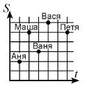 Придя в школу, каждый из пяти друзей отметил на координатной плоскости точку с такими координатами: время I, затраченное им на дорогу от дома до школы, и пройденное расстояние 5. Кто из ребят шел быстрее всех?
