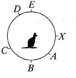 Nos kangura skierowany jest w kierunku punktu X. W kierunku którego punktu będzie skierowany nos kangura, jeśli obróci się o 270° zgodnie z ruchem wskazówek zegara wokól punktu, w którym stoi?