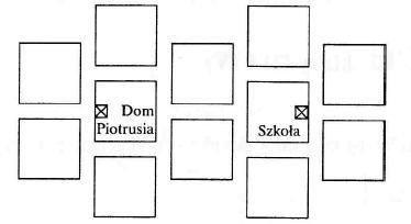 Poniższy rysunek przedstawia plan osiedla, w którym mieszka Piotrus'. Każdy kwarta! na tym planie jest kwadratem o boku 100 m. Jaka jest minimalna odległość, którą Piotruś musi przebyć udając się z domu do szkoły?