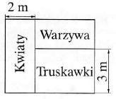 Prostokątną działkę o powierzchni 30 m podzielono na trzy prostokątne grządki i przeznaczono na kwiaty, warzywa i truskawki (niektóre wymiary podane są na rysunku obok). Jakie jest pole (w m2) powierzchni przeznaczonej pod uprawę warzyw, jeżeli grządka przeznaczona na kwiaty ma pole 10m2?