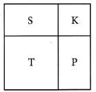 Ogród w kształcie kwadratu jest podzielony na 4 części: sadzawkę (S), kwietnik (K), trawnik (T) i piaskownicę (P) - patrz rysunek obok. Trawnik i kwietnik mają kształt kwadratu. Obwód trawnika wynosi 20 m, a obwód kwietnika wynosi 12 m. Jaka jest długość obwodu sadzawki?