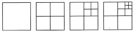Kwadraty kolejno dzielimy na części tak, jak pokazuje rysunek. Pierwsze cztery kwadraty mają 1, 4, 7 i 10 części. Be części będzie mieć piąty kwadrat?