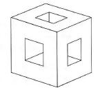 Kubo briauna lygi 3 cm. Iš jo išpjauti 3 kanalai, kurių skersinis pjūvis — kvadratas su kraštine 1 cm. Koks yra gauto kūno tūris (cm3)?