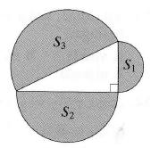 Ant stačioj o trikampio kraštinių nubrėžti pusapskritimiai. Jų plotai pažymėti S1, S2, S3. Kuris teiginys teisingas?