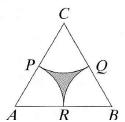 Lygiakraščio trikampio ABC kraštinė lygi 6. Kraštinių vidurio taškai yra P, Q, R. Kam lygus paveikslėlyje užtušuotos srities PQR plotas?