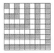 Šalia esančiame piešinyje užtušuotas tam tikras skaičius mažųjų kvadratėlių, sudarančių didįjį kvadratą 9x9. Kam lygus užtušuotų kvadratėlių skaičiaus ir neužtušuotų kvadratėlių skaičiaus skirtumas?