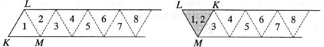 Piešinyje pavaizduota ilga popieriaus juostelė, padalyta į 2000 trikampių brūkšninėmis linijomis. Tarkime, kad juostelė (žr. kairįjį brėžinį) lankstoma per brūkšnines linijas skaičiais pažymėta tvarka taip, kad juostelė visą laiką užima horizontalią padėtį, o jau sulankstyta kairėje juostelės dalis užlenkiama ant dešinės (dešiniajame brėžinyje pavaizduota viršūnių K, L, M padėtis po pirmo lenkimo).