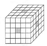 Kubas, kurio kraštinės ilgis yra 5, padalytas į vienetinius kubelius. Iš kubo pašalintos 3 kubelių eilės (žr. paveikslėlį). Gautas kūnas panardintas į dažus. Kelių kubelių nusidažė lygiai viena siena?