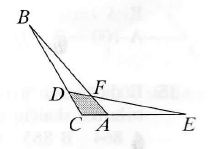 Paveikslėlyje trikampiai ABC ir DEC lygūs, DC = AC = 1, CB = CE = 4. Trikampio ABC plotas lygus S. Kam lygus keturkampio AFDC plotas?