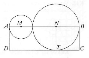 Paveikslėlyje taškai M k N atitinkamai yra iš išorės besiliečiančių apskritimų centrai. Tiesė MN kerta tuos apskritimus taškuose A ir B (neskaitant apskritimų lietimosi taško). Stačiakampio ABCD kraštinė CD taške T liečia tą apskritimą, kurio centras yra taškas N, Stačiakampio ABCD plotas lygus 15. Koks yra trikampio MNT plotas?