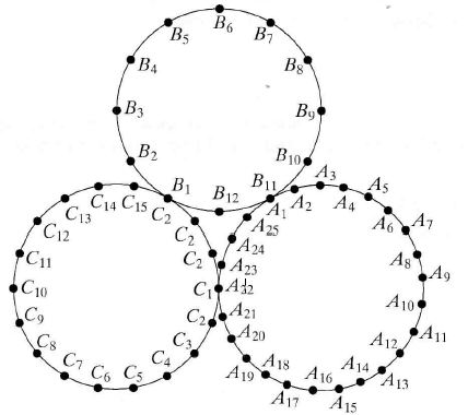 Žaidimo lentoje yra trys apskritimai su pažymėtais taškais A1, A2, ..., А25, B1, B2, ..., B12, C1, C2, ..., C18. Lentoje žaidėjo loštukas startuoja iš taško A1 ir užima naują padėtį pagal tokią taisyklę: kiekvienu ėjimu galima peršokti du tarpelius tame pačiame apskritime tiek prieš, tiek pagal laikrodžio rodyklę.