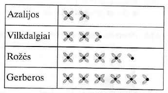 Pavaizduota lentelė rodo įvairių gėlių rūšių skaičių botanikos sode. Iš sodininko Tadas sužinojo, kad sode yra 35 rūšys azalijų, 50 rūšių vilkdalgių ir 85 rūšys rožių. Kiek rūšių gerberų yra botanikos sode?
