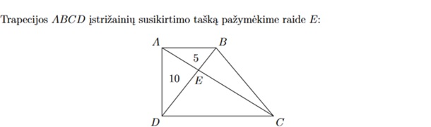 Paveikslėlyje pavaizduota trapecija ABCD, kurios kampai A ir D yra statieji. Trapecijos įstrižainės AC ir BD dalija ją į keturis trikampius. Paveikslėlyje nurodyti dviejų trikampių plotai. Kam bus lygus trapecijos ABCD plotas?