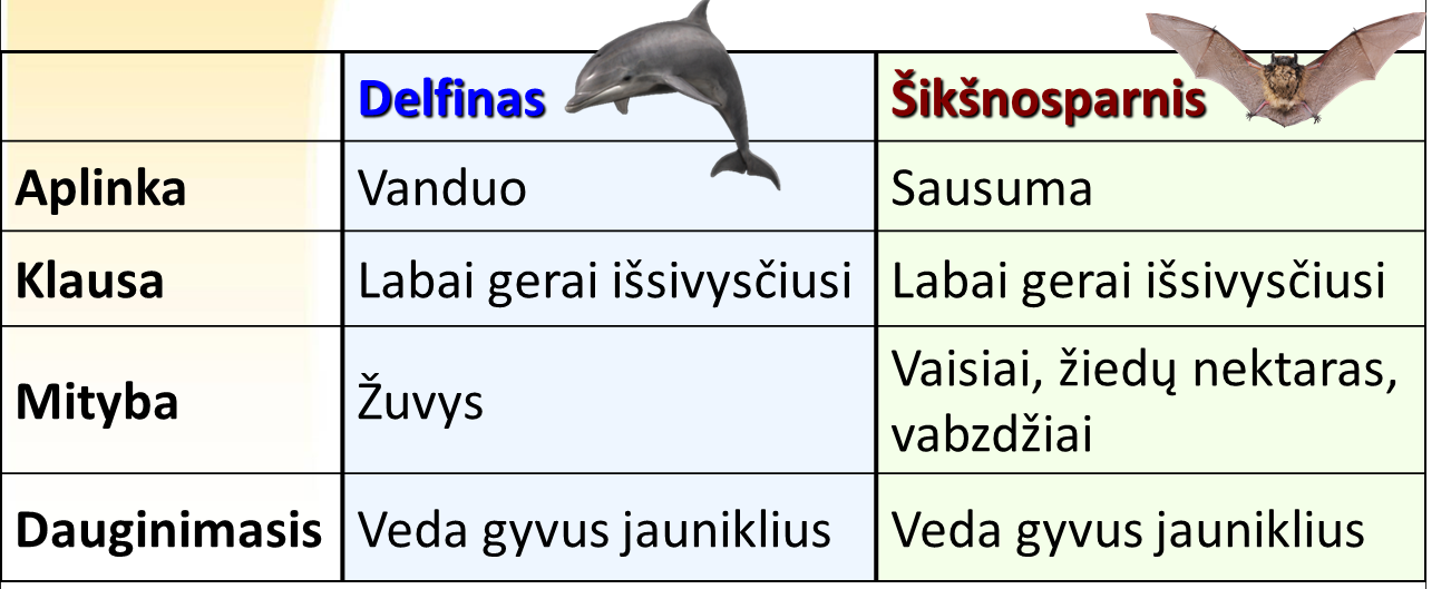 7. Pagal kurį lentelėje pateiktą požymį delfinai ir šikšnosparniai priskiriami žinduolių klasei?